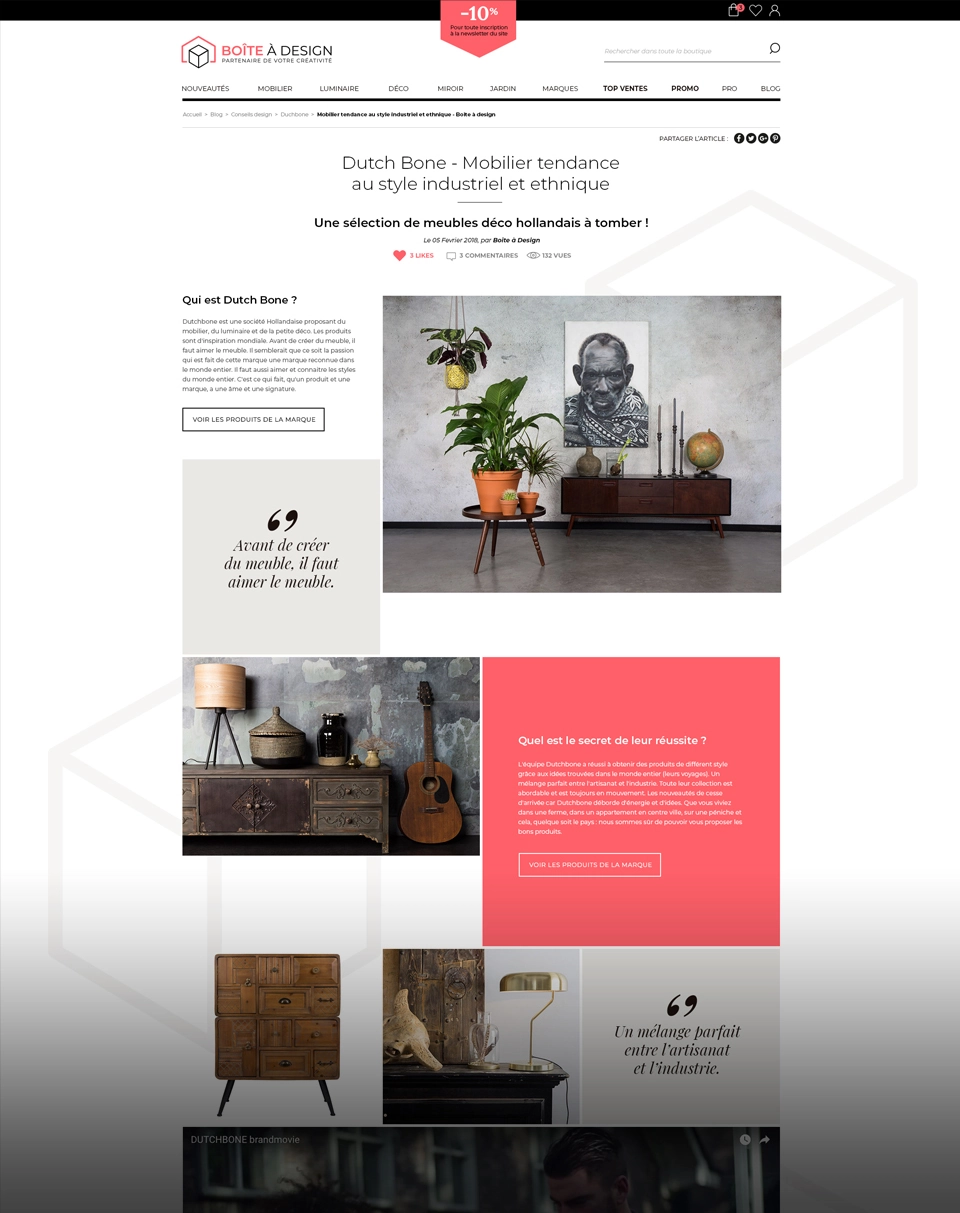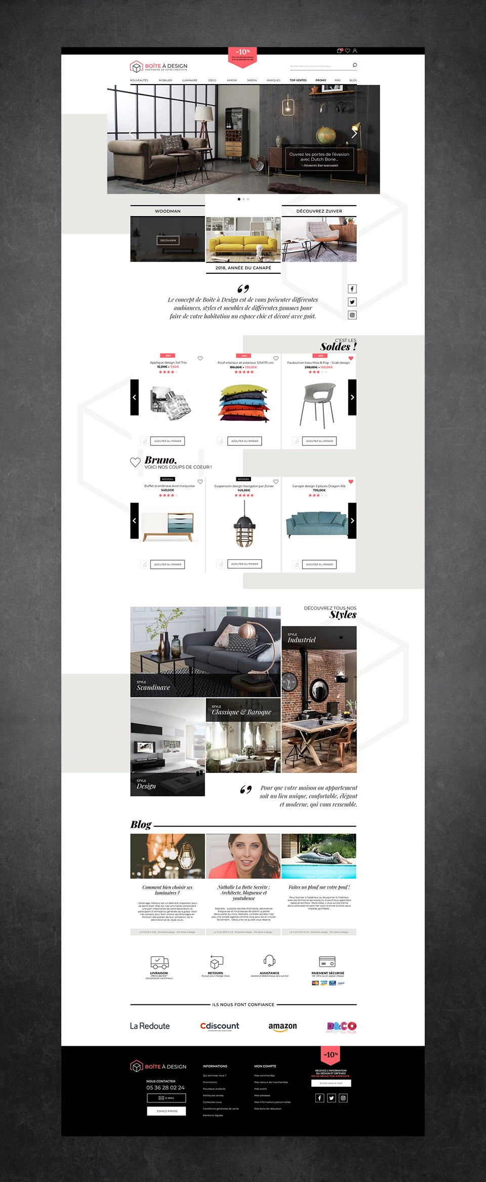 Spécialiste de la vente en ligne de mobilier contemporain et d’objets déco, Boîte à design sélectionne avec soin des pièces de créateurs et des marques emblématiques du design. Pour accompagner sa croissance, ses deux fondateurs ont souhaité faire évoluer son identité et repenser entièrement son site e-commerce.