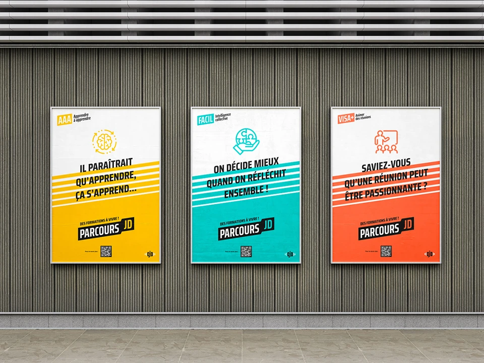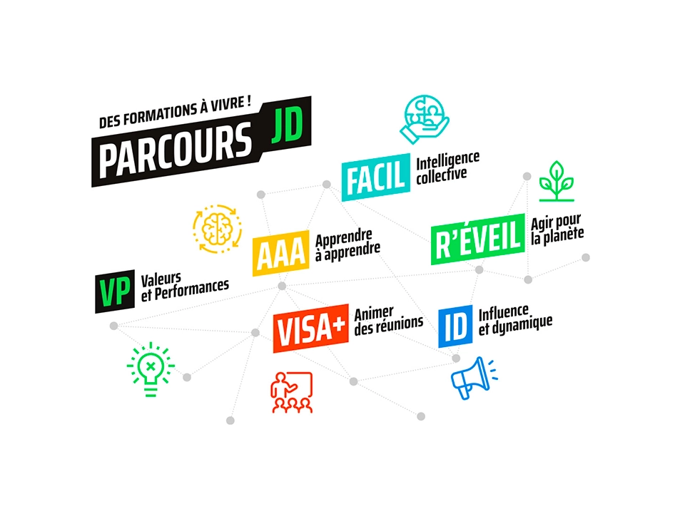 Identité visuelle du parcours de formation du CJD : création du logo et de la charte graphique, déclinaison sur 6 modules thématiques. Conception de la plaquette institutionnelle nationale avec fiches modulables et PPT. Pour la rentrée 2025, création d'une carte de voeux et d'un set de stickers inspirés du manifeste, offerts aux membres VIP pour affirmer leur appartenance au mouvement.