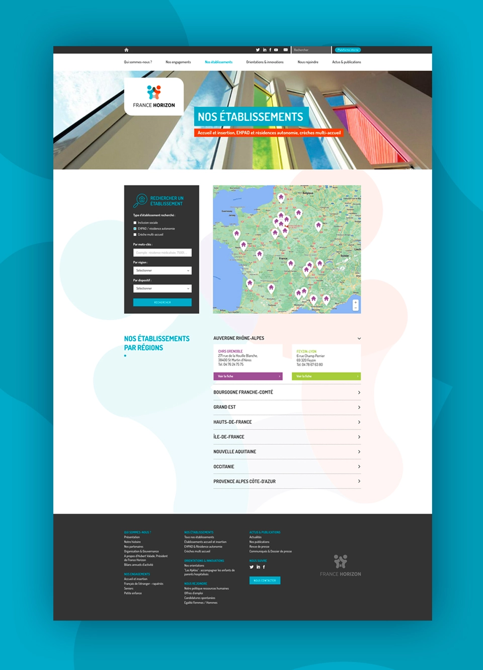 J'accompagne l'association depuis plus de 15 ans sur le design de leur site web. Une refonte graphique initiale a permis de retrouver la cohérence et la chaleur humaine de la charte graphique. Valorisation de leurs engagements avec 5 codes couleur dédiés. Carte interactive des établissements avec filtres avancés pour une recherche optimale. Section recrutement valorisée (emploi, service civique, bénévolat).