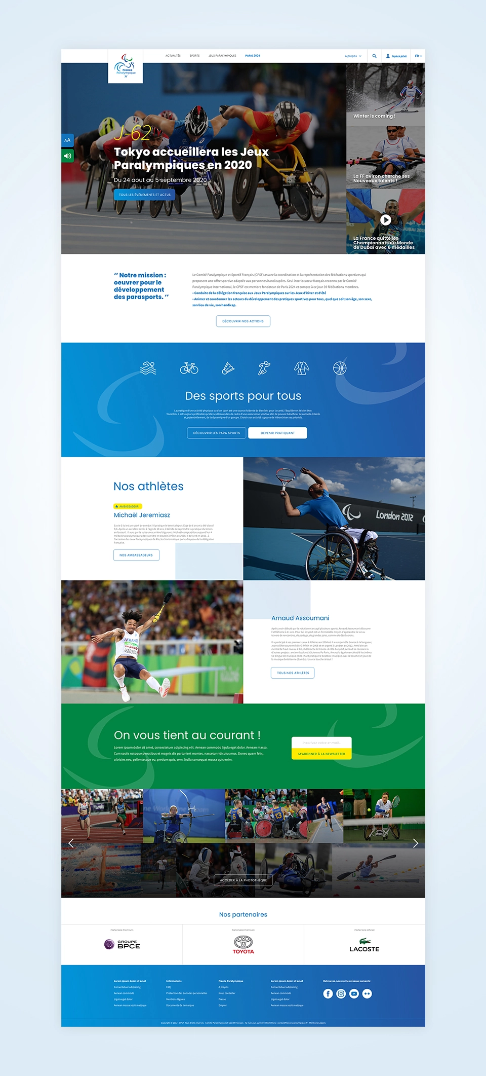 Proposition de refonte du site corporate France Paralympique dans le cadre d'un appel d'offres en agence. Maquettes design responsives épurées, aux couleurs de la charte graphique du Comité : mise en valeur des athlètes en action, navigation claire pour présenter la mission, l'histoire, les programmes, les parasports, les compétitions et l'actualité du mouvement paralympique français.