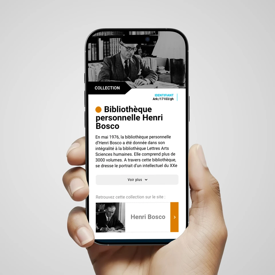 Conception et design d’une architecture riche et hiérarchisée (développée sous Omeka), pensée pour articuler plus de 10 000 contenus numérisés à travers collections, expositions, sites dédiés... incluant un outil de recherche avancé et une carte interactive. Navigation claire et intuitive sur tous supports grâce à un système visuel sobre et cohérent.